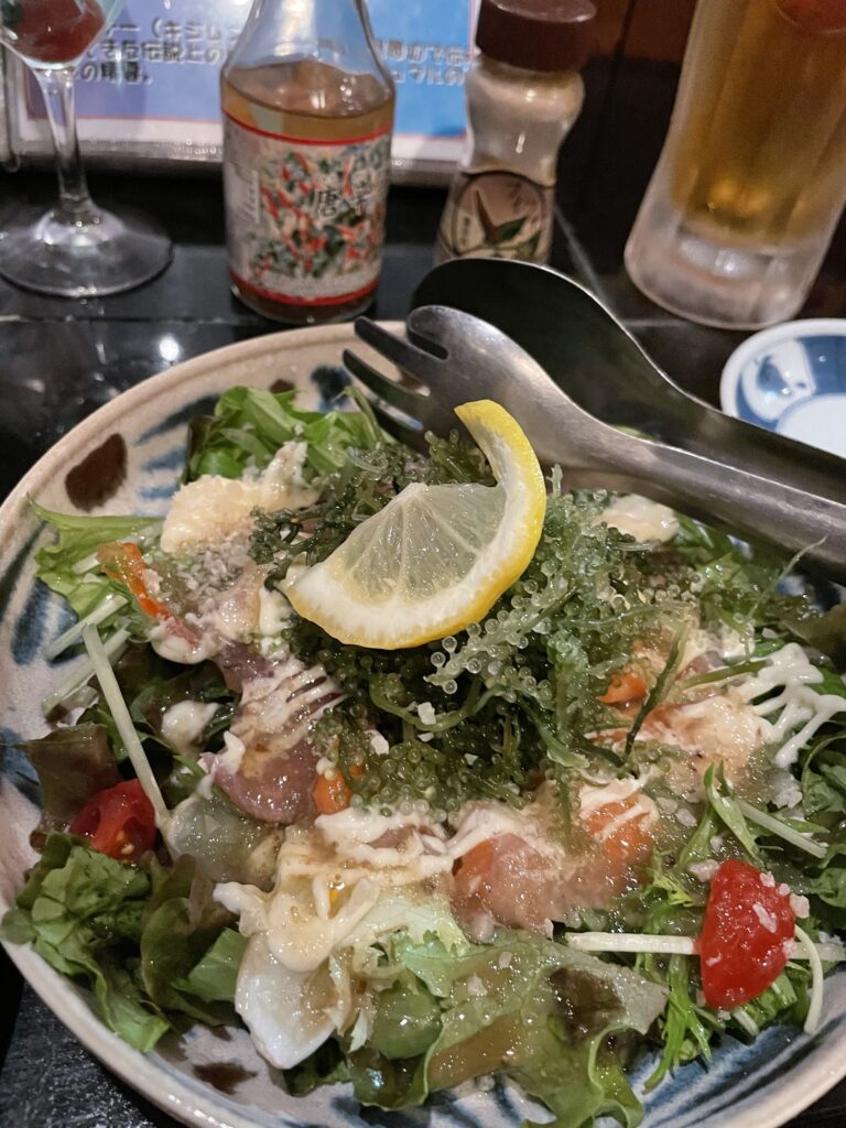 ・海ぶどうとサーモンのカルパッチョ(サーモンが少ないからと別のお魚入れてくれてた)