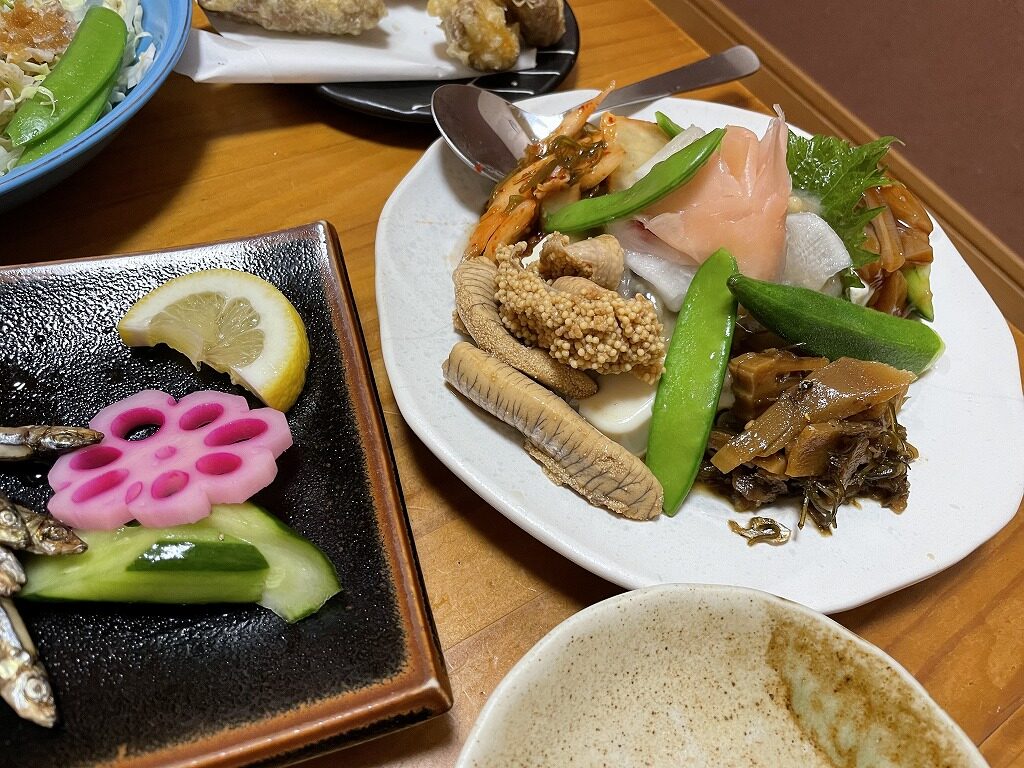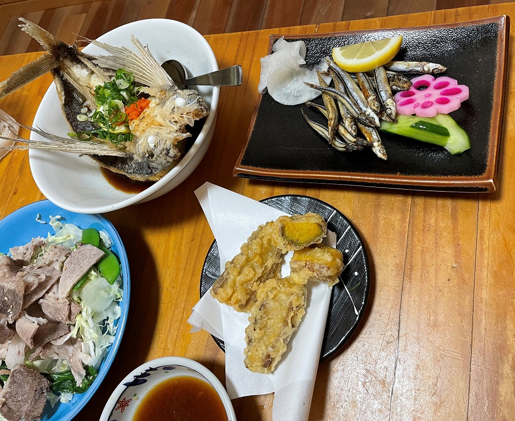 さてお料理は、お魚いろいろ(キビナゴやシマアジもちろんトビウオも!)お刺身・焼き・蒸し、豚ポン酢、野菜や安納芋の天ぷら等々、次から次へとやって来ます!