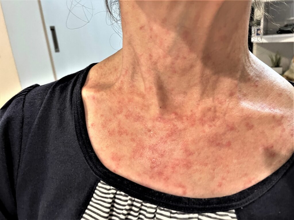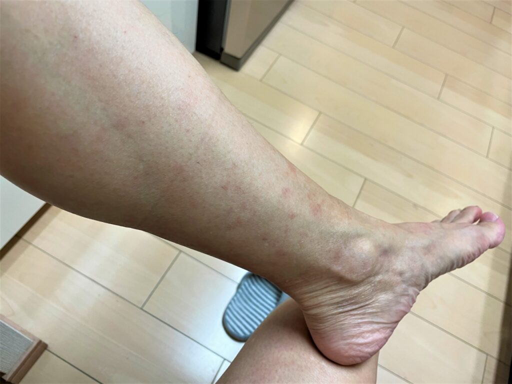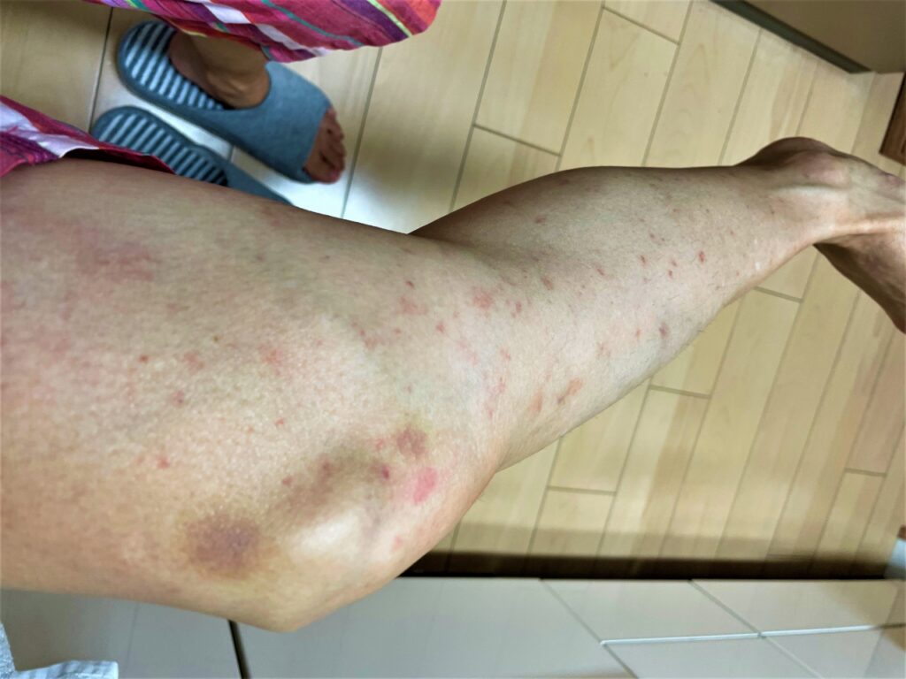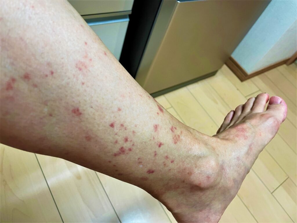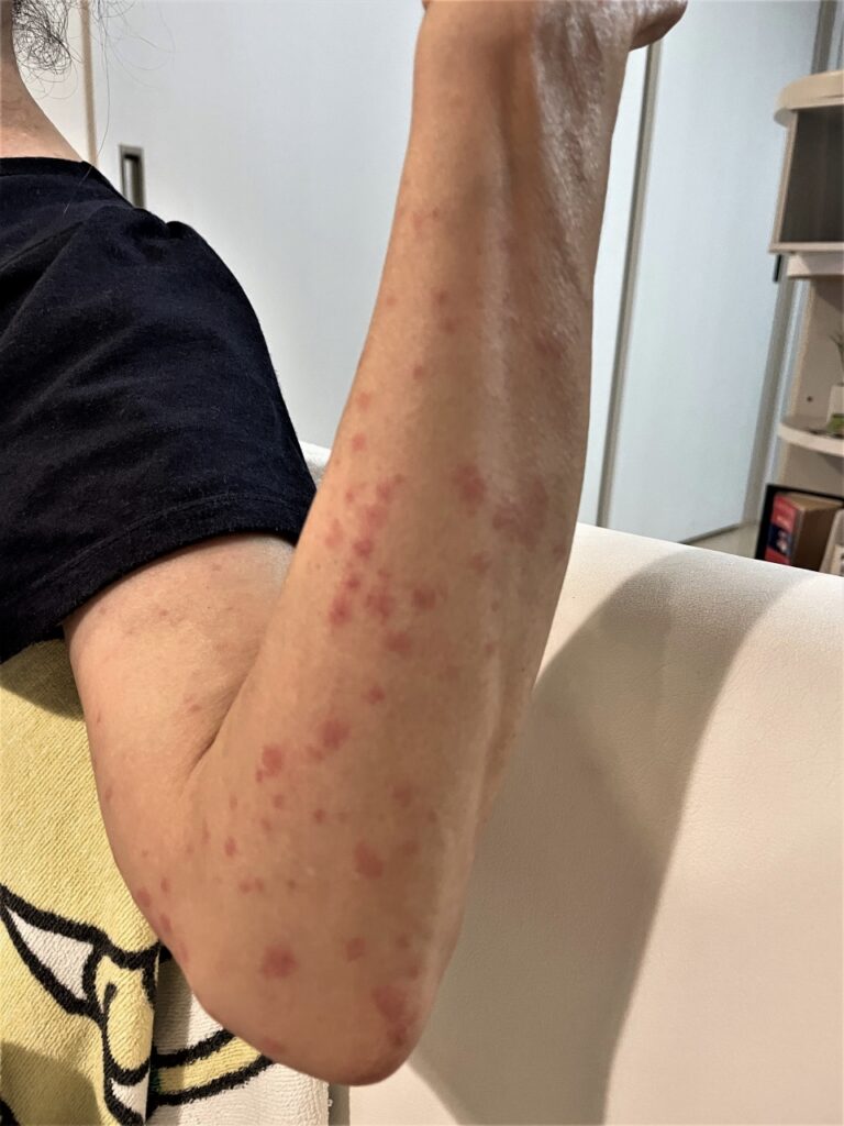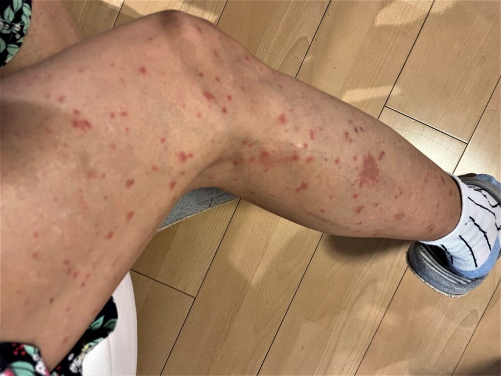 顔を除くほぼ全身にブツブツが広がって、かなり痒くなり、色も真っ赤になって膨らんできてしまいました。